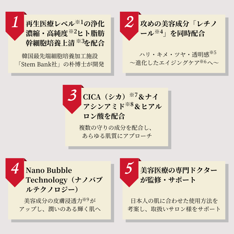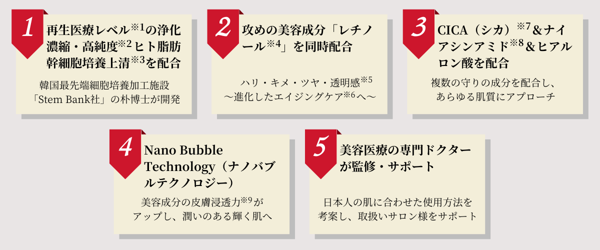※1 Stem Bank社の製造技術・基準によるヒト脂肪細胞順化培養液エキス(保湿・整肌成分) ※2:整肌成分 ※3:ツボクサエキス(整肌) ※4:整肌成分
