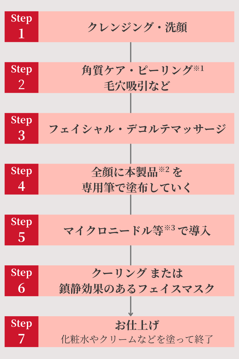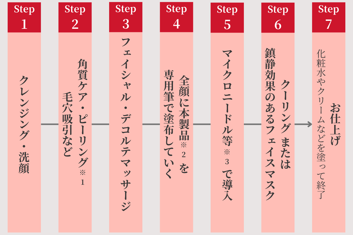 ※3:導入方法は、マイクロニードル(サロン用)の他、エレクトロポレーション等でも可能です。本製品は粘度がないため、溶液をお顔に塗布後、エレクトロポレーション機器のプローベ先端に、エレクトロ専用基剤(ジェル状等)を塗布し導入すると施術しやすくなります。